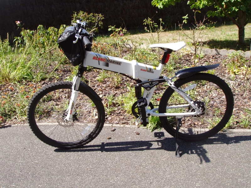 Vtt electrique pliant taille m etat neuf batterie lithium 36 volts n9.6 amperes 2502watts 7 vitesses tout suspendu av et ar frein a disque av et ar jante alu 26 pouces sac de transports fournie pour plies materiel ganatie 1 an batterie neuve temps de charge 2h dimensions vlo pli 94x82x36