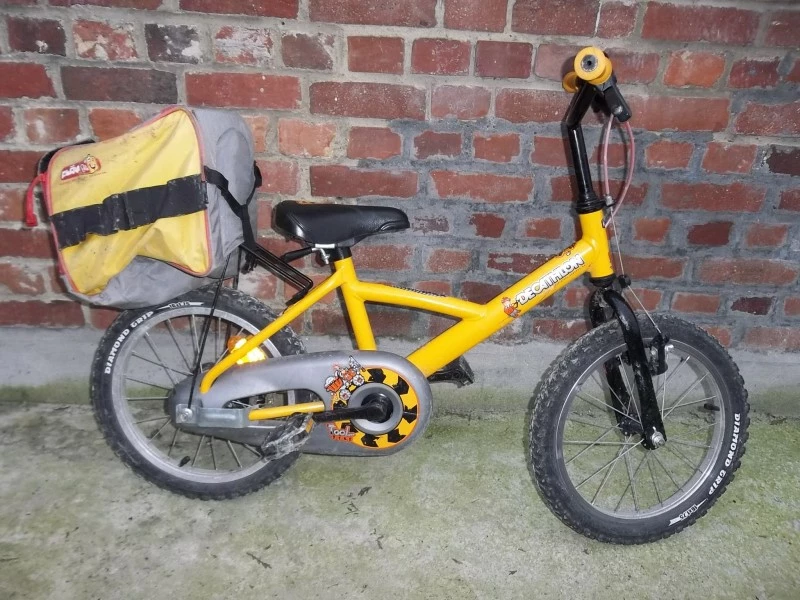 Vends vlo dcathlon jaune, avec sacoche “coffre” de transport et sonnette, en bon tat, freins ok.n’hsitez pas me contacter pour + d’infos!