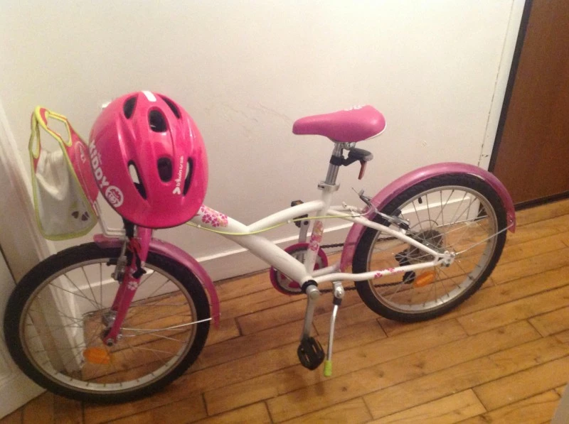 C est un vlo de fille rose un petit sac devant,une lumire devant et derrire,un casque de marque et il fait des vitesses de 1 6et on peut monter le guidon.
